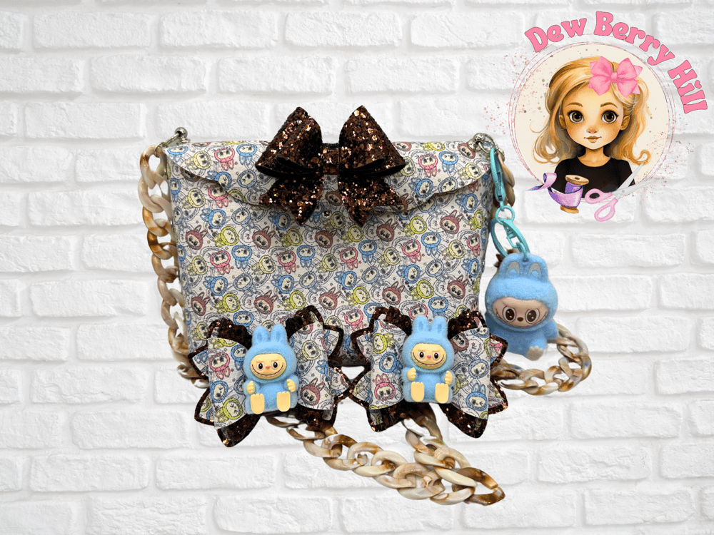 These bows measures approximately 3 inches across and are on an alligator clip with teeth. The purse measure approximately 6.5 inches across with an acrylic handle. Keychain included.